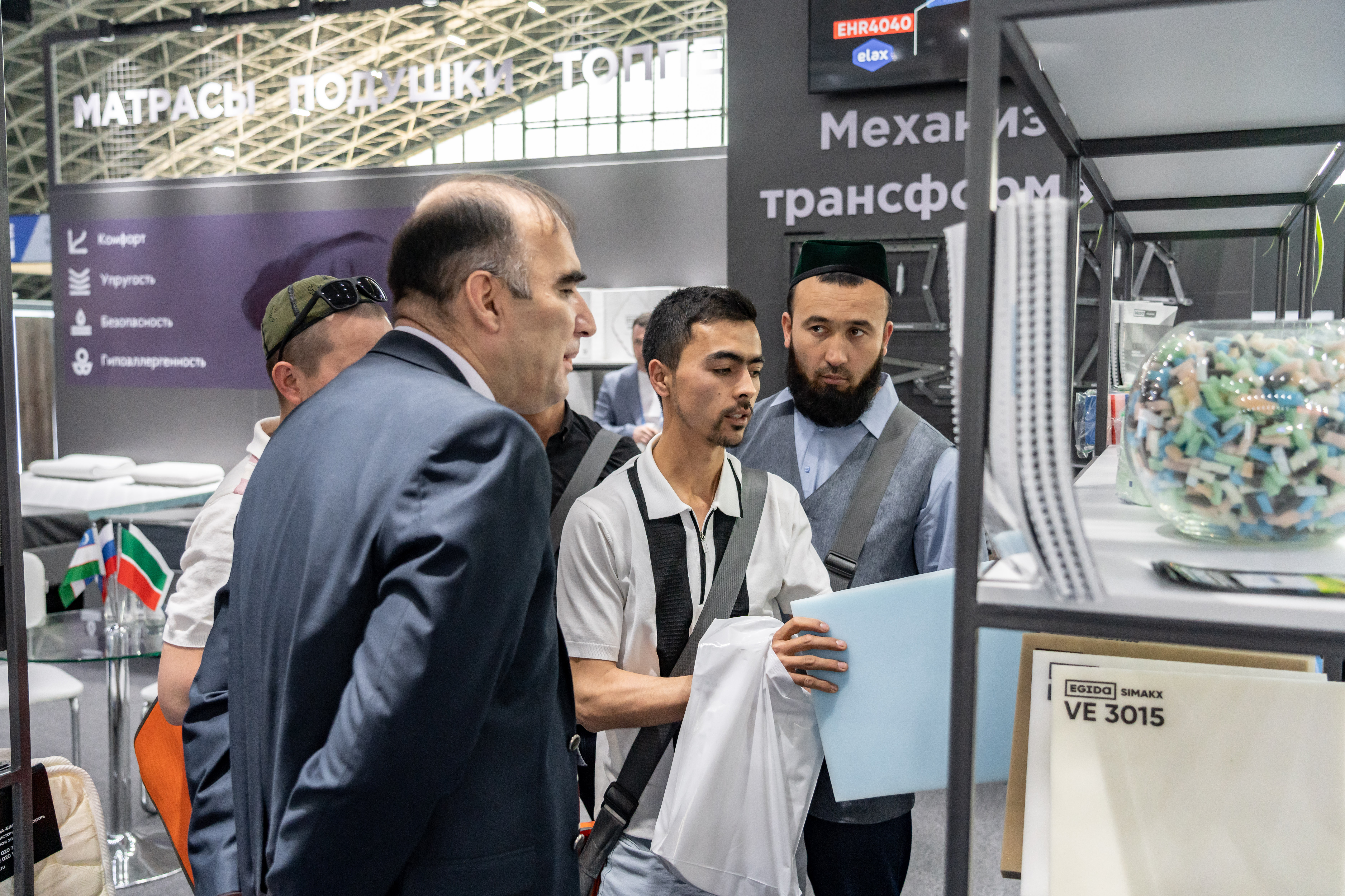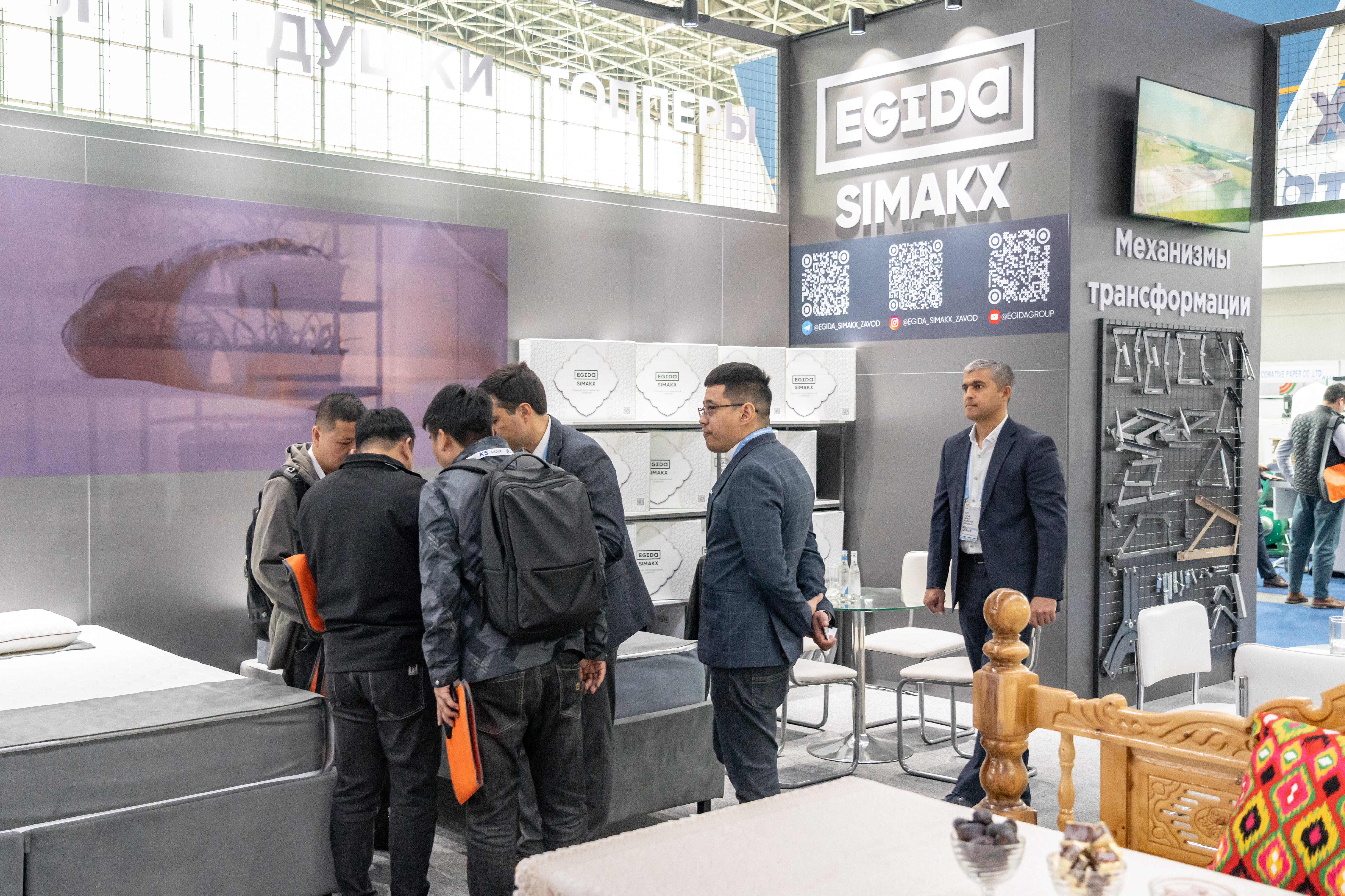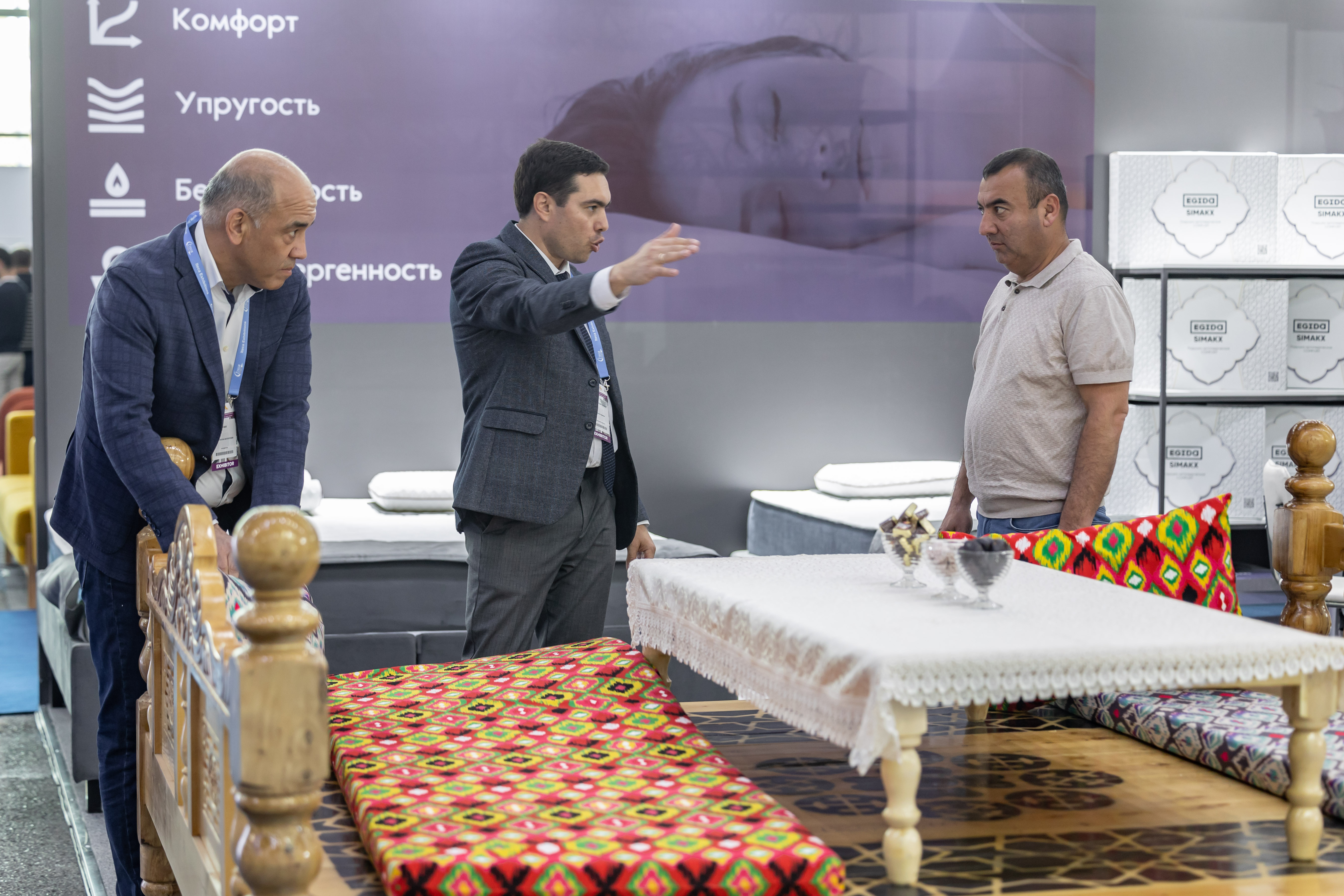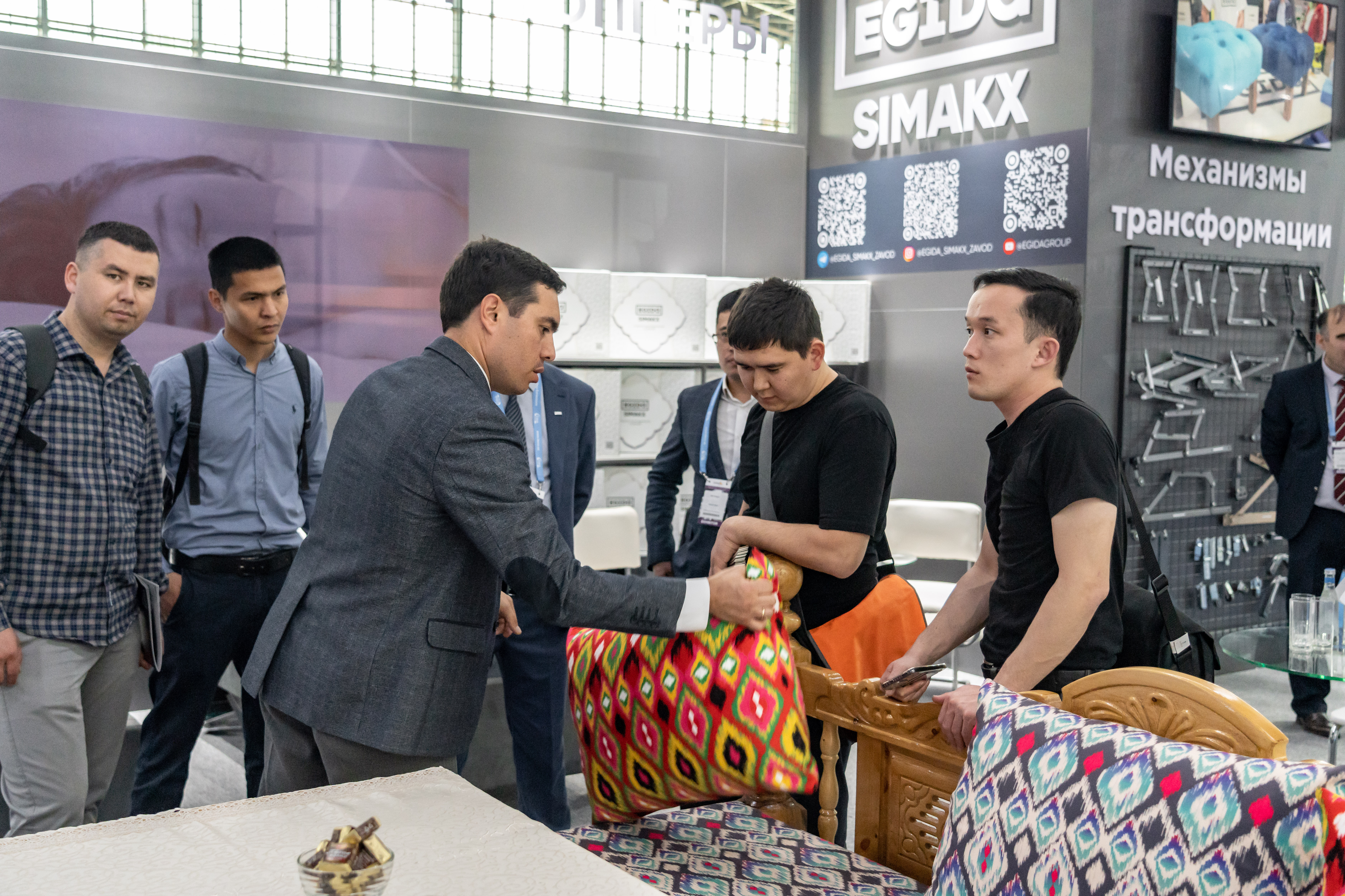 На своем стенде EGIDA представила как привычные для себя экспозиции, связанные с комплектующими для мягкой мебели (ППУ, механизмы трансформации для диванов, мебельный клей, ткани), так и ряд экспериментальных продуктов для локального рынка. Так, центральное место экспозиции было отведено под узбекский топчан, на котором были размещены традиционные для народов региона переносные матрасы – курпачи с комфортными марками пен в качестве наполнителя. Большой интерес вызвали образцы тканей с национальными орнаментами.